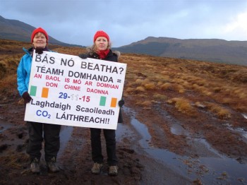 I mbéal na doininne, agus sléibhte Dhoire Bheatha sa chúlra, bheir Mary Attenborough agus Cordelia Nic Fhearraigh ón grúpa comhshaoil Meas Iarthuaisceart, a bunaíodh i nGort a Choirce sa bhliain 2002, tacaíocht don ghluaiseacht domhanda in éadan Athrú Aeráide a tharla ar an Domhnach 29ú Samhain 2015. Ar an lá úd sin, sheas na mílte daoine ar fud an domhain le chéile chun aird a tharraingt ar géarchéim an chéid seo, sé sin, athrú aeráide agus téamh domhanda. Ainneoin stoirm Clódach ag réabadh na tíre tháing na mílte daoine amach i gcathracha na hÉireann leis an teachtaireacht tábhachtach a thabhairt do pholaiteoirí, go bhfuil an t-am ag éirí gairid, agus iad ag tabhairt aghaidh ar Comhdháil Aeráide na Náisiúin Aontaithe (COP21) a bheas ar siúl i bPáras ón 30ú Samhain go dtín 11 Nollaig 2015. Beidh ceannairí stát agus rialtais ó 147 tír (25,000 oifigeach ina iomláine) ag teacht le chéile ag an comhdháil seo chun réiteach a shocrú leis an téamh domhanda a theorannú go 2oC. Insíonn an eolaíocht dúinn go bhfuil baint mhór ag astaíochtaí gás ceaptha teasa (greenhouse gas emissions) leis an téamh domhanda agus leis an aimsear mínádúrtha, atá ag tarlú go minic anois ar fud an domhain, agus, má tá muid chun an pláinéad a chaomhnú do na glúnta a bheas ag teacht inár ndiaidh, go bhfuil géarghá le gearradh siar ar dóadh breoslaí iontaise (fossil fuels) agus go gcaithfear an carbón a choinneáil sa talamh. Níl againn ach an pláinéad amháin. Níl pláinéad B ar bith ann.